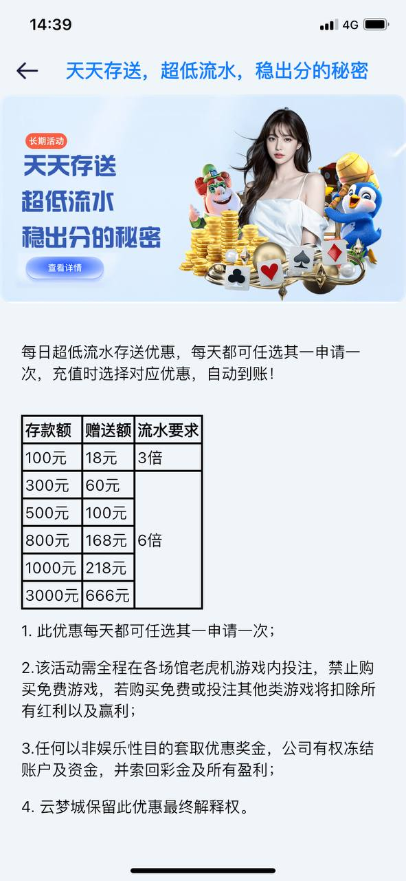 3、该活动仅限投注电子游戏,彩金提款上限100,多余金额需扣除,禁止购买免费游戏,藏分, 互转,违反扣除所有金币;